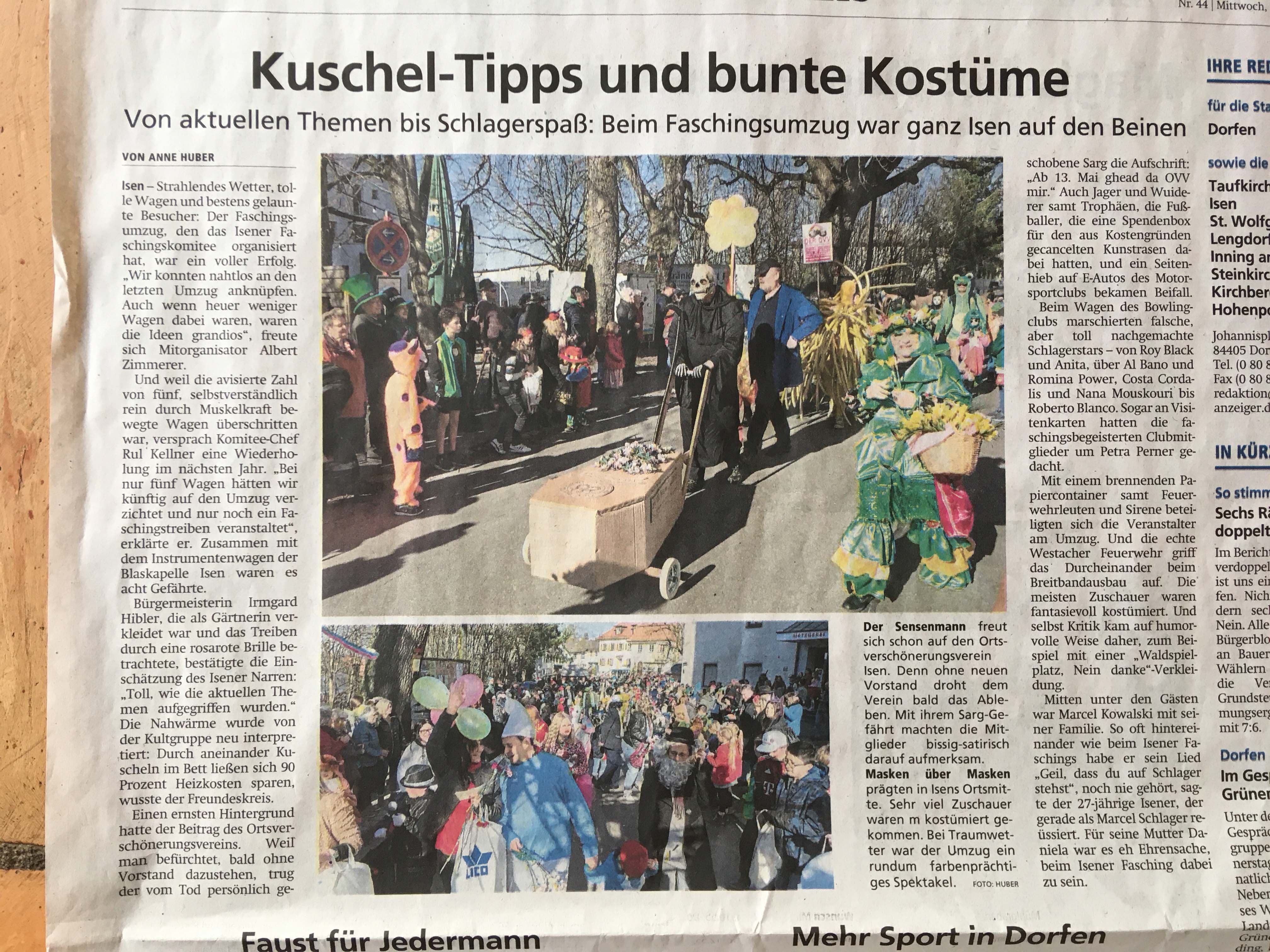 Pünktlich um 11.11. Uhr knallten auch in Isen die Sektkorken, heuer im Fußballerstüberl des Freizeitheims. Außerdem wurde zeitgleich die Ananas-Bowle freigegeben. Das Faschingskomitee feierte nämlich zusammen mit dem Faschings-affinen Bowling-Club den Start in die Saison. Während das Komitee sich intensiv auf das Starkbierfest am 12. März vorbereitet, weil turnusmäßig kein Kappenabend stattfindet, konzentriert sich der Bowling-Club, der mit einem Kegelverein so wenig zu tun hat wie die Glühbirne mit der Mostbirne, vor allem auf den Prunk-Umzug am Faschingsdienstag. Nach einem hervorragenden Mittagstisch mit Schweinekrustenbraten, brachte Bäckermeister Josef Sattler persönlich seine beste Haustorte vorbei. Einziger Wermutstropfen war die Fußverletzung von Komitee-Chef Rul Kellner, was die Stimmung jedoch nur zu Beginn trübte.